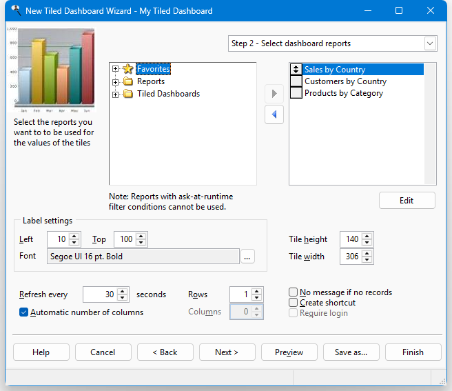 Columns: the number of columns to display tiles in. The maximum value is the number of tiles in the dashboard; for example, if you've selected three reports, you can have up to three columns (one per tile). This option is disabled if Automatic number of columns is turned on.